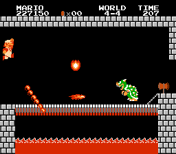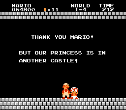 My favorite memories of SMB are the castle stages.  The black and white castle with the lava and fireballs was more than its simple graphics.   More so than other NES games, the castles in SMB felt dangerous.  As you neared Bowser, King Koopa as he was called in those days, his fireballs started coming at you from nowhere, which was terrifying to a five year old.  When you got to him and he was as big a big Mario and you could match him fireball for fireball if you had a fire flower it was an epic showdown.  More likely you reached him small and it was David vs. Goliath, and the choice was either jump over or run under to cut the bridge.  And after you beat him the immortal words of “Thank you Mario, but our Princess is in another castle” came to deflate you.  The quest is not over, it has just begun.  While story is not any NES games strong point, there is something timeless about Mario’s fairy tale quest.