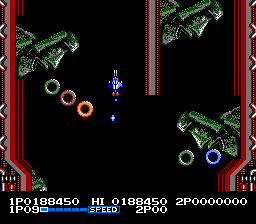 The levels display what is the best part of Life Force: the crazy stage subjects. In what only makes since in the context of NES games, and in fact is one the best things about the NES, the player will fly all over the place with no real sense of connection between the stages. One level looks like the insides of some giant monster, the next you are shooting giant jumping Moai heads. It’s the brilliant surrealism that made the NES great. The first stage in this game looks very much like a living creature. The stage walls and the enemies all seem very organic. The enemies look like blood cells and the boss is a giant brain. After that, you go to a simple canyon, now scrolling vertically instead of horizontally, into a military installation of sorts with s robot/flying machine boss. The third stage is a sun or some such thing, with fire and flaming birds and dragons all over the place. Then its through a body again, but this time vertically. Then horizontally through some canyons and pyramids with Pharaoh head boss. The last boss appears to be a planet with a giant snake curling around it. All of this rendered in beautiful 8-bits. The sheer insane variety of stages and enemies is one of the best parts of the game.