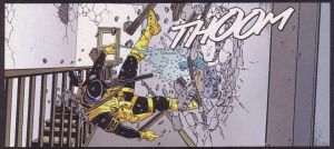 Issue 52 starts with a bunch of stuff no one cares about. (Actually, it’s the fallout from the big conflict that was the series 50th issue spectacular and touches on the current situation of all of the members of the JSA) But near the end it gets to the good stuff. Wildcat got a tip about some terrorists and he recruits Power Girl because she is bulletproof. She takes the lead and attacks by flying in and punching the terrorists through a wall.