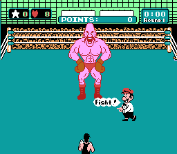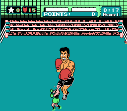 The gameplay is a large part of Punch-Out!!’s well loved design. There is no way they could have actually convincingly done an actual boxing game for the NES. So Nintendo made a game that looked like boxing, even if it played like something completely different. The gameplay is deceptively simple. Watch for visual clues from the opponent to predict his punches and dodge or counter punch. It is all about recognizing the time for and timing your moves. As the game goes on the timing becomes more strict and the opposing boxers include more fakes. So the player must perfect his timing. The early fights are easy enough to help the player get familiar with the moves available. There are not many. You can block, dodge left or dodge right as far as defensive moves go. Your punches are left body, right body, left head, right head. B for left, A for right, with the default punch being to the body and head punches by simply pressing up on the d-pad. There is also a super punch, which can only be used if a player has a star. A star, or up to three, is gained by punching the opponent at certain times and lost by getting hit. The super punch is used by pressing select. The controls fit perfectly to the NES controller. The d-pad controls mostly defensive moves, by pushing right left and back for the dodges and block respectively. All the buttons are used, but the control are simple enough that anybody can play the game.