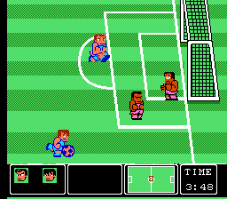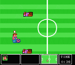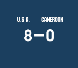 Much of the fun of the game is in the simple but effective controls. The player controls one player and cannot switch during play. If you have the ball the A button passes (I think, I may have the buttons reversed) and the B button shoots. If one of the A.I. controlled teammates has the ball, he will follow your directions. If you push A, he will try to pass you the ball, or if you push B he will try to shoot. When the opponent you has the ball your only goal is to tackle the ball away from him. The players have chunky little sprites that show humorous amounts of emotion, especially when they get tackled. Tackling is actually a great strategy with no penalties being called. Eventually if you tackle you opponents, enough they will be knocked out and lay apparently dead on the field. With some of the weaker teams, like Cameroon, you can easily get 2/3s of the team on the ground. There is also the bicycle kick, done by pressing A and B at the same time. This is how you do your special shots and how you kick the ball in over the goalkeepers head as you stand in the goal.