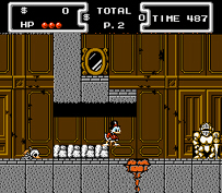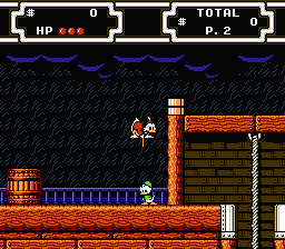 The game casts the palyer as the equally rich and greedy “Uncle” Scrooge McDuck. Being the greedy bastard that he ism Scrooge sets off around the world searching for valuable treasure; fortune anf glory and such. He is aided by trusty pilot Launchpad McQuack, young ducklings Huey, Dewey, Louie and Wendy, and the cybernetic Gizmoduck. Again it plays similarly to Mega Man, in that the player can choose the order they play the levels. The levels are less straightforward than Mega Man’s are. They branch and loop, being less a gauntlet to pass to reach the boss and more a scavenger hunt. It encourages the player to look in all the nooks and crannies to find all the treasure they can. While most of the game apes Mega Man, the difference in level structure, along with it’s great license appeal, gives it enough of its own feel to set it apart. The big gameplay hook is Scrooge’s weapon: his cane.