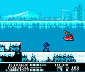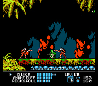 The first game was a very straightforward action game with a few twists. The first was that every mission had the player made a team from five available Joes: Duke, Snake Eyes, Rock-n-Roll, Blizzard or Captain Grid-Iron. The game designated one character the leader, the player chooses the other 2 team members. Which of course meant you choose Snake Eyes and another, because who is going to leave the ninja. The other twist is in how the game is structured. Each mission has three stages. The first was infiltration, a go from point A to point B level. The second part usually took place inside a base and had some sort of rescue or sabotage goal. The third stage would be a boss battle with a recognizable Joe foe. There is some variation, but this was the basic set up. The first G.I. Joe is an original and well-made game, even if it is just short of spectacular.