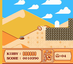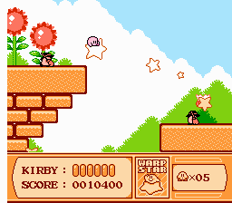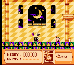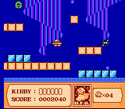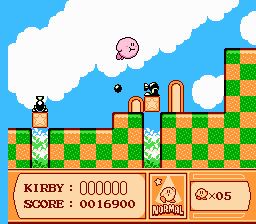 The last level is particularly fantastic. After you chase down the series bumbling baddy King Dedede, retrieving the Star Rod that he had stolen, only to realize that he had stolen it to protect Dream Land from the resurrection of the ancient evil Nightmare. So Kirby takes the Star Rod in hand and fights this villain, with some help from King Dedede. The game suddenly becomes a shooter, with Kirby shooting stars with the rod and Nightmare shooting black stars back at him. Then they land on the moon and have a final battle there that ends with Kirby defeating Nightmare while blowing a hole in the moon. It is one of the best boss battles on the NES.