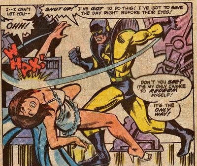 Jan helps her husband’s inferiority complex by flirting with Thor and Cap. Her goal is to passively-aggressively get Pym to propose. I guess making him feel like he’s not worth shit would make him want to lock that down, so to speak, before she wises up. I can’t argue with her logic seeing as it works, kind of. And by kind of worked I mean that Hank had a psychotic break (breakdown #2 for those keeping count), proclaimed that he was the Yellow Jacket and that he had killed Hank Pym. Then he forced Janet to marry him. Realizing early on that Yellow Jacket was actually Hank; Janet went along with her beau’s delusion. It all worked out in the end, with Hank and Janet married and Hank returning to his senses, blaming the breakdown on a mysterious experimental gas.