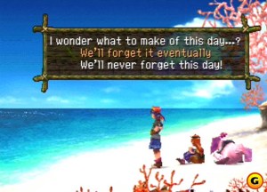 Honestly, I absolutely love Chrono Cross. Both because it is a great game and because of my memories of the time when I played it for the first time. I came to the PS1/N64 generation of consoles pretty late, not getting a 64 until Christmas ‘99 and then a Playstation near my birthday (October) the next year. Chrono Cross was one of the numerous RPGs is bought the next year, flush with money from mowing lawns and too old to ride my bike but still too young drive. Plus, that summer I has home alone. Part of my family went on an RV trip to the west, to see the Grand Canyon and Yellowstone, but anyone who has spent a week in an RV with 8 or so people know why I declined to join them. My two brothers closest in age spent a month or so with an uncle 500 miles away, but I didn’t go with them either. So at home, with my Dad who was working all day, after I finished whatever mowing I had to do that day I had the house, and TV, to myself. The games I played that summer! Final Fantasy IX, Final Fantasy Tactics, Legend of the Dragoon, Lunar 2 and Chrono Cross. Amazing games (save for LoD) and while I still would rate most of them among my favorites in the system, but Chrono Cross is the game I most associate with that summer, if only for the summery tropical aesthetic.