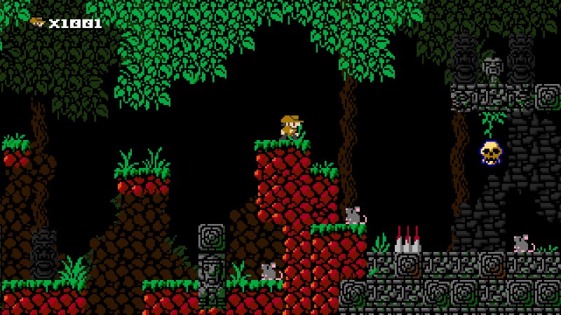 1001 Spikes was released a few weeks ago across a slew of download platforms. People remarked on both its punishing difficulty and its 8-bit aesthetic. Those are remarkable things. The game is hard. The mechanics are tight, but the game tests the player’s timing, reflexes and (to a lesser degree) memory. The graphics and sound are both highly reminiscent of the early NES days, the days of Spelunker and Super Mario Bros. The look is not a slapdash imitation, but a loving recreation of that aesthetic. That loving recreation is the heart of the game. As you unlock more characters and modes it becomes clear that the whole game is just a love letter to 2-D video games.