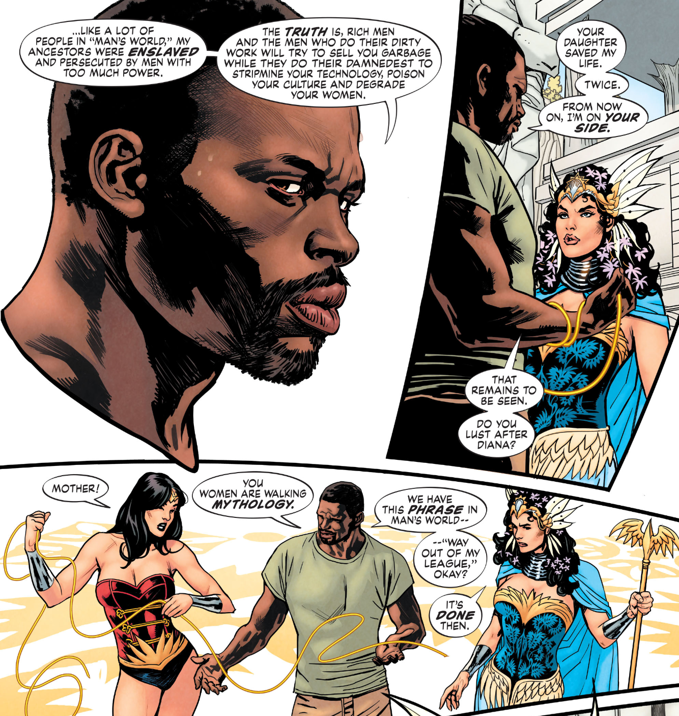 The Diana of Legend of Wonder Woman is a wonderful protagonist. That book has managed to free her of the expectations of what Wonder Woman must be and simply tells a story about a character. In the first couple issues, the young Diana is inquisitive and restless. She is very aware of her duties as the Princess of Themyscria, but also chafing against that role. Being born of the island, she is one of the few that sense the corruption that is creeping through the island. She convinces Aclippe, the greatest of the Amazonian warriors, to train her, showing her dedication and resolve. This is a strong character, but not a perfect one. This is best illustrated in her conversation with her mother, when Diana finally realizes that her mother also chafes against the restrictions placed on her by her position, but has enough respect for the laws of her land to work within them, that her mother cares enough about Diana’s happiness that she is willing to allow to go her own way to an extent. It is just great storytelling.