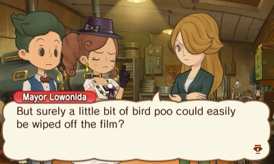 The story is the other big problem. The structure fails this game utterly. If there was an initial mystery that lead to all the other cases it would have felt like a real story, but instead it just introduces a bunch of characters before moving to a toothless epic final showdown. It does start with a pair of mysteries, one involving the disappearance of Professor Layton and the other having to do with Sherl, the talking dog that shows up at new protagonist Katrielle’s shop. Those mysteries are not dealt with at all. Professor Layton is gone, as are all the characters from the previous 6 games, and Katrielle has a talking dog. Instead of dealing with either of them, you spend most of the game solving non-mysteries for the police, with a few good ones mixed.