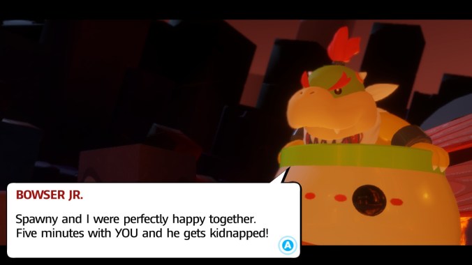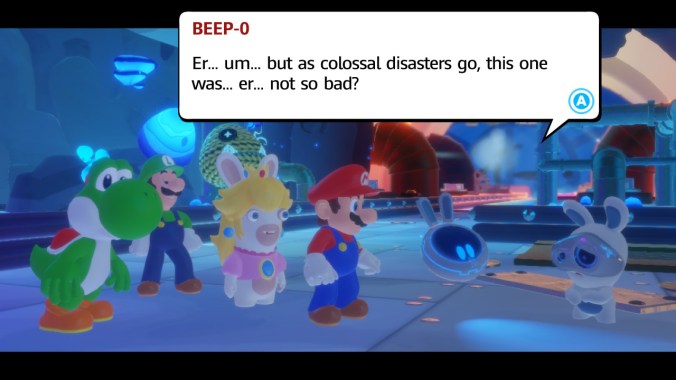 Also kind of awkward and unsatisfying are the parts in between battles where you find chests and solve simplistic puzzles. They feel vaguely in the Mario vein, but mostly end up feeling like padding. I guess there needed to be some connective tissue between stages but these puzzles mostly feel like they are just taking up your time. It does nail the tone of the Mario series. I am far from an expert when it comes to the Rabbids, but the Mario characters feel about like they would in a Nintendo developed game. I would say I can’t imagine seeing Mario wielding a gun in a Nintendo game, but Smash Bros exists. Mario is the can-do hero, Peach alternates between being sidelined and wanting to get in on the action. There are various goofy Toads. Luigi is the weird schlub also-ran to Mario. Bowser doesn’t make an appearance until late, but he is on brand and honestly this is about as enjoyable as Bowser Jr. has ever been. The highlight is the opera ghost boss, who opens with a song.